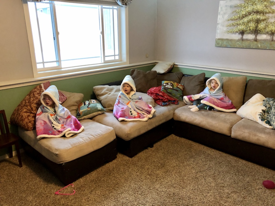 hooded blankets and read a book until they warmed up. We had another good nap and managed to play inside for the remainder of the day without too much fighting. We broke out the special color markers (ones that only color specific types of paper and are amazing!) and Harper fully colored her whole sheet, Emerie colored a few baby sharks and Reagan adamantly begged for Tyler and Uncle to see it her creation. It was pretty cute.