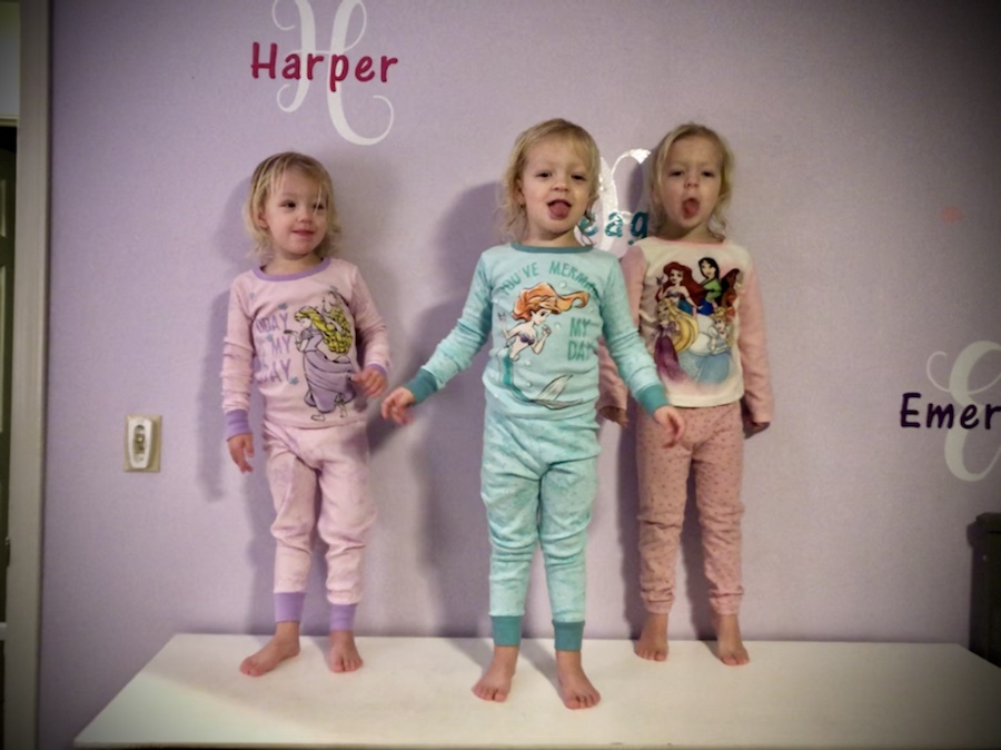 Craig and I were both able to switch off and handle some morning meetings and work calls while Nanny and Pricey visited for a few hours to help us out! The girls played with play dough, strummed the guitar, destroyed the house with their toys, and had all kinds of fun. The day was going okay until nap time, when all three refused participation and would NOT settle down…all three! What a way to kick off the week and not in a good way. Poor Harper wanted to drift off to sleep so badly, but Emerie and Reagan prevented her from doing so by singing, yelling, throwing toys and jumping on their beds until we finally gave up and got them back up.