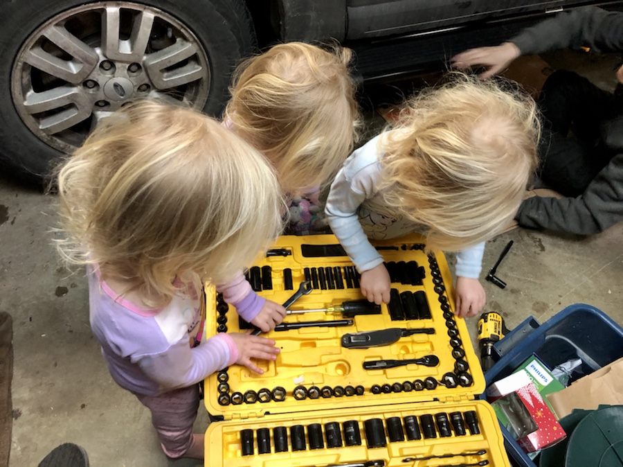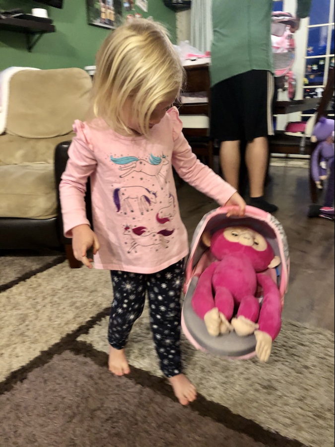 Craig and I continued to juggle working our hours while watching the girls. We’ve found it really helps to hide toys for a short period of time and then get them back out. It doesn’t take much for something to be “new” and exciting again for a toddler. I pulled the foot-push cars out from the shed and let them thaw in the living room and moved the random toys and furniture off to the side as much as possible. The girls played for a while with them, alternating who sat in which one, Craig strung some LED Christmas lights on two of them, they drove with blankets on top for “peek a boo” and carried baby dolls and monkeys around with a loud goodbye, mommy! Of course fighting occurred over who could use what (since two are red and one is teal), when someone wouldn’t move for someone else, or if a foot was accidentally run over, God forbid! While the activity passed the hour for us adults, we still opted to go to nap a few minutes earlier than normal and they went down pretty quickly.