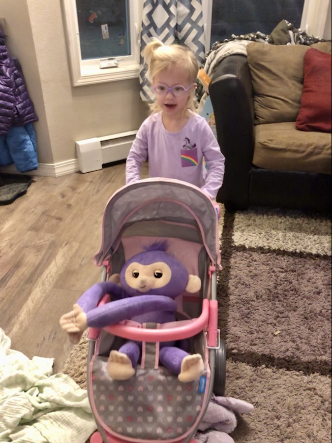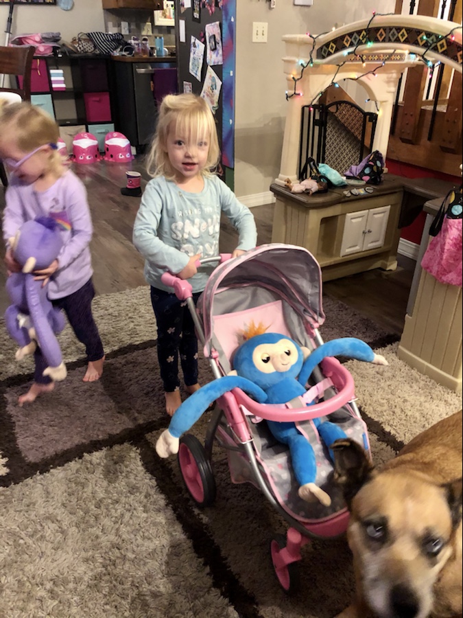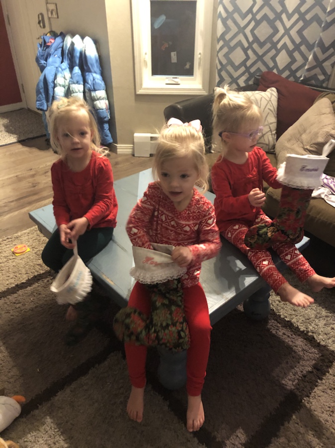 Emerie was the early riser today so we plopped down on the couch and watched a little Moana before the other two were up. I try to make early morning one-on-one time count, with lots of snuggles, knowing that the girls are always sharing our attention by one-third and don’t often get to relax without their siblings present or the normal excitement around young children. After breakfast everyone went to the playground to burn off energy and I pulled out their rolling, mini four wheelers to push around the living room after lunch. They are now saying four wheeler, since the real sized one is sitting in the front yard, but it comes out sounding more like a four la la or in the holiday spirit, fa lala. Pretty cute indeed once you know what they are saying. They attempted to push their dolls on the wheelers as well as their giant monkeys. It’s crazy to think the toys used to seem so big compared to the girls; now the long legs have to crunch to ride them.