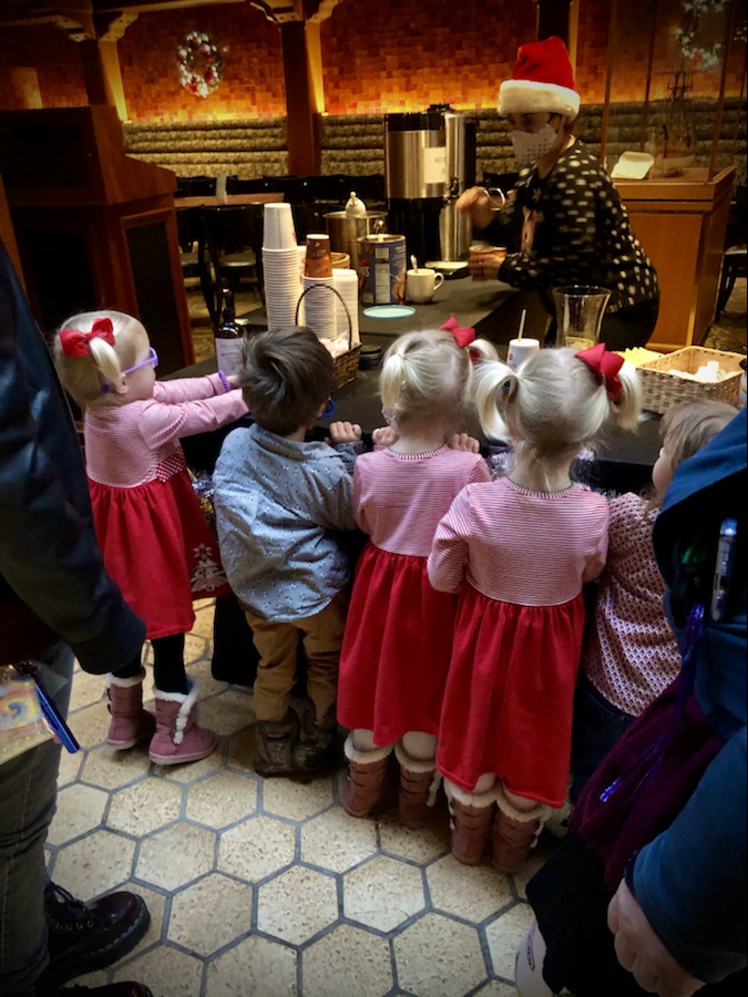 We looked at the fancy village and the girls interacted with the pretend Santa and beautiful Christmas trees and we attempted to do a family photo (keyword attempted). One of the nice ladies in the lobby made five hot chocolates and gave everyone a tiny, snowman cookie. The snack was enjoyed by all and then we watched five toddlers sprint down the halls, giggling and burning energy. I’ll also note they did a GREAT job wearing their masks, something we have practiced very little since we barely go to any public (indoor) places, AND all climbed back into the strollers when asked to do so.