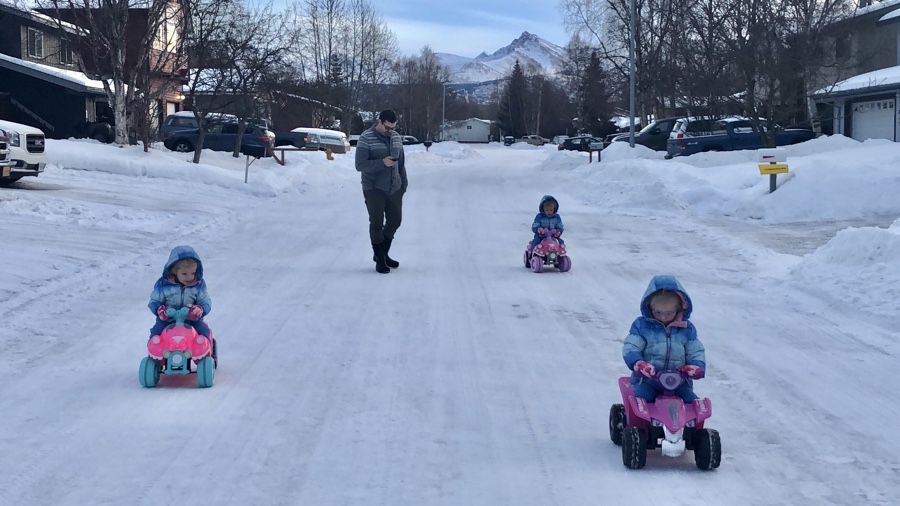 The cars did decently on the flat, icy areas, but required a little bit of adult foot muscle whenever the road became rougher. We made it about six houses before we turned back, and in true parenting style, walked the end carrying the cars while the children laughed and ran full blast.
