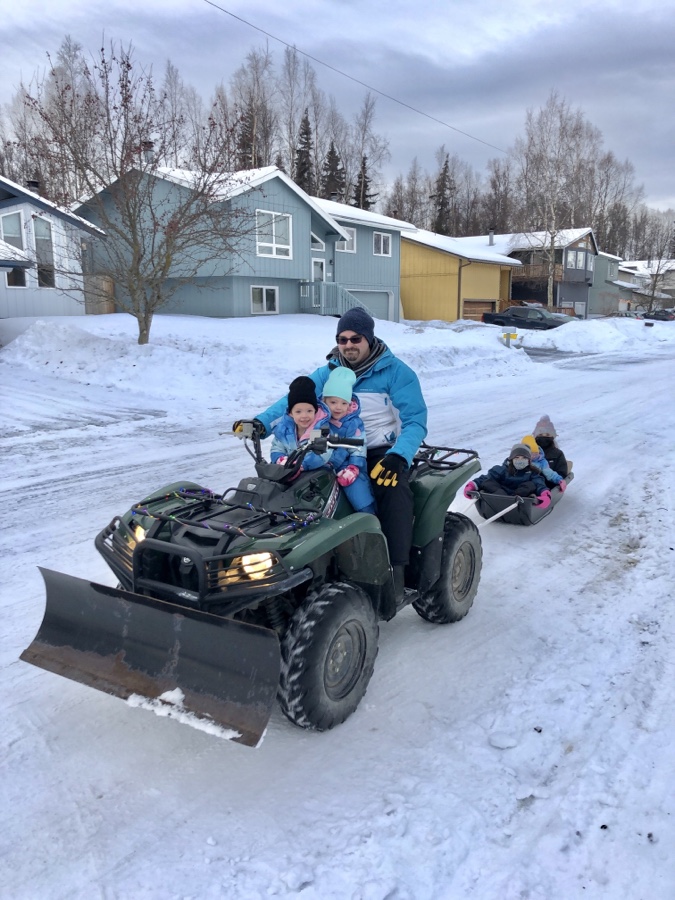 Craig put the plow on the four wheeler and after clearing the driveway, he convinced the girls to sit behind it while pulling them down the block in the big sled (sitting on my lap, of course!). They talked about that adventure all evening and yes, we went super slow the whole time!