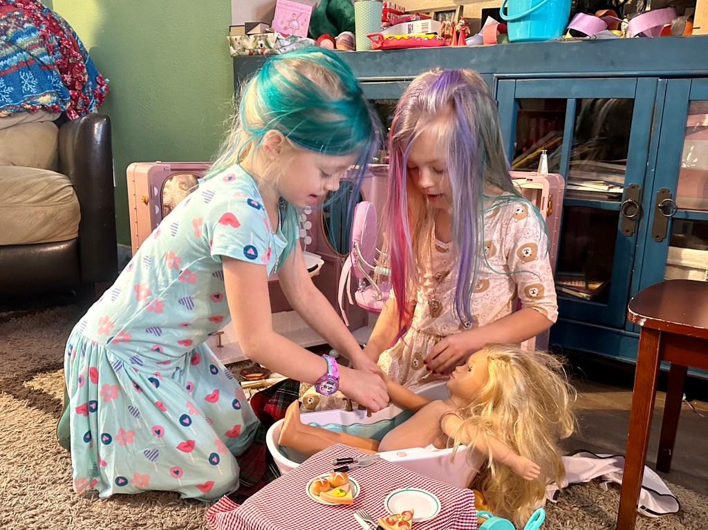 For the big gift, this took more creativity. This is the first year we opted for something specific to each girl’s desires: a doll spa/salon “room” and salon chair for Harper (the chair actually pushes up like at a real hair salon), a gift that remained in the middle of the living room for a week with constant attention. Emerie received a portable Frozen castle set that folds out, and a doll table and chair set, because she kept asking for a doll table and chairs on repeat. Very specific and that was on her mind at least a month, because her answer hasn’t changed. Craig and I found a drivable princess carriage for Reagan and a cute doll bathtub. All three took turns driving their stuffed animals and barbies around the living room and it was one of the more popular choices for the day. They also coordinated a covert op to trash the bathroom and give their dolls baths- you know, or just general drowning of those poor dolls- which resulted in a lovely water mess to clean up. Real life I tell you…at least they were having fun?