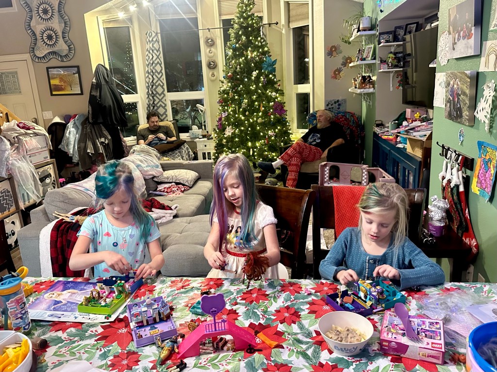 Like past years, presents were grouped in threes so similar things were opened at the same time, and then a couple group things to all open together, such as crafts and alphabet magnets. The other highlight was the princess Lego sets, which HAD to be built immediately before opening more. It took us about three days to open everything; we tried to space it out so everything was played with, and that worked pretty well. On day three the kid digital cameras were opened- one green panda, one purple unicorn, and one pink unicorn- and they’ve been running around with them ever since! One can only imagine the images that are saved when we load them on the computer, and Harper figured out how to add mustaches to the screen so we likely all have mustache photos now.