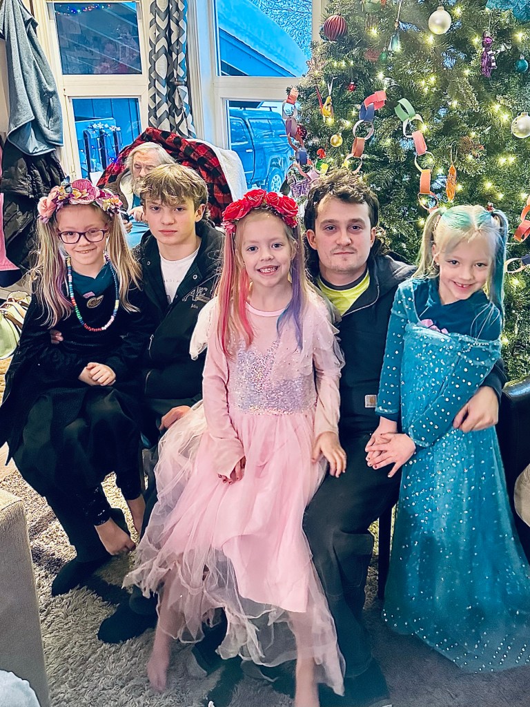 We had a full house on Christmas Eve, with the boys and Keegan and Jenny, Uncle William, and Papa Cliff. Within five minutes of cousins arrival, the living room was a mess of wrapping paper, new toys and clothes, excited children, and general chaos. We all may need hearing aids by the time we are forty at this rate (and that isn’t very far from now for some of us!)! Aunt Jenny’s selections were spot on again this year, gifting everyone cute pink, purple, and blue flower bag clips to signify whose was whose, and lots of girl stuff. The horse set was a hit, as were the Barbies. Everyone paused long enough in the evening to sit and build the Lego Christmas globe ornaments (which are super cool and light up!). Building these is not for the weak, and she did it with all five. The boys were off and running with their Jurassic Park (Corbin) and Minecraft (Elliot) themed slippers and toys. I love that Jenny and I get to swap for Christmas and she can buy all the frilly, girly things while I get to peruse the boys aisle, which I don’t venture down often. Craig made a delicious lamb dish, which the kids even ate (when you call it steak!), and the frozen fruit dessert by Jenny was also a hit. We also forced the children into all matching Christmas pajamas with a less than successful group photo at the end of the night.