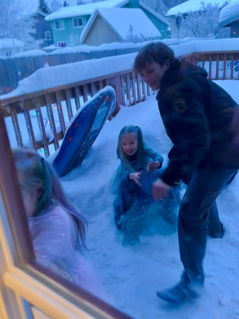 We also received quick visits from cousins Tyler, Jaren, and Chatum, with the girls displaying the usual level of crazy excitement to see them and then breaking out into fantastic coughing fits. Not having grown up with any family living in the same state, I really enjoy that the girls get the chance to see five of their cousins on the regular. During the visit Chatum decided the level of child giggles and harassment was enough, and much like Uncle Will has done this winter, opted to toss the kids straight out into the snow pile. Watching him pry three wildly giggling and screaming children down the stairs without help from the other laughing adults in the room, and making it to the back deck with a bit of help from Grandma Sue, was definitely the highlight of that day. Well it was, until the aftermath of screaming and crying and cold blooded rage re-entered the room, which I couldn’t help but chuckle at. Such memories in the making.