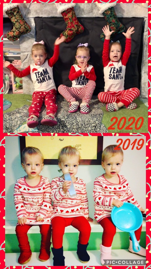 Looking back at photos from this time last holiday season, right before our impending 2020, the girls look SO much tinier. They advanced so much in the past twelve months, from personalities to everyday skills to talking up a storm! By the end of 2019 they were saying single words and pointing when they wanted an action, were pros at walking and running around, still ate in the triplet table and threw food constantly, started trying to use their clippy pillows and learn to buckle things, and were very unhappy to be stuffy with a cold.