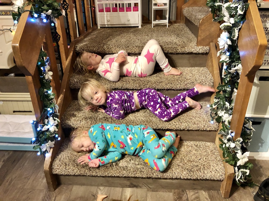 After a quick hour of Christmas Eve prepping after bedtime, which included placing out the already wrapped presents from sneaky wrapping sessions over a few weeks, Craig and Amanda built the new vanity and mirror set and I stuffed stockings. I spaced out all the tasks to prep for the big day, making the night before go much quicker. All three left a cookie out for Santa, Emerie leaving hers on a tiny doll plate after adamantly demanding it had to be that way. Everyone slept well and went to bed discussing Santa’s impending visit.