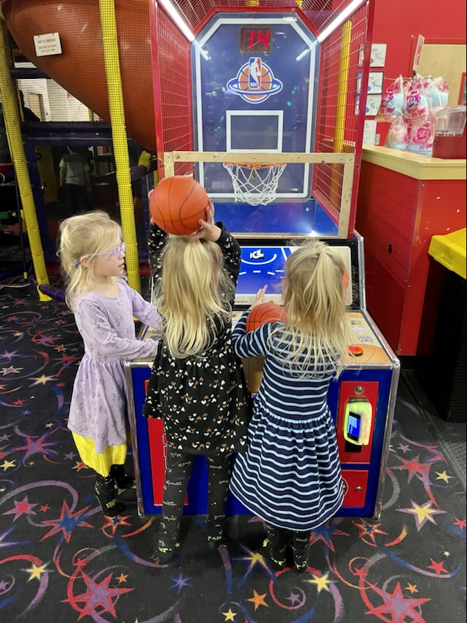 We devoured snacks, rode the tiny train and spinner rides multiple times, and played a few games. The girls all enjoyed the basketball one and even made some hoops; watching all three play at once is definitely a good source of entertainment. In several cases the ball hit the rim and immediately ricochet straight into someone’s face- causing quite the moment of laughter. Calm down, the balls were much softer than real basketballs….which aren’t so fun when colliding with your nose. The girls enjoyed any game that involved whacking things and tested out their fruit ninja skills with Oaki. Toward the end of the night we watched a few friends race around the track on the other side of the center, with five very excited littles watching. I did not plan to be out until after 8 on a school night (who are we kidding, any night), but the visit went so well the time passed quickly.