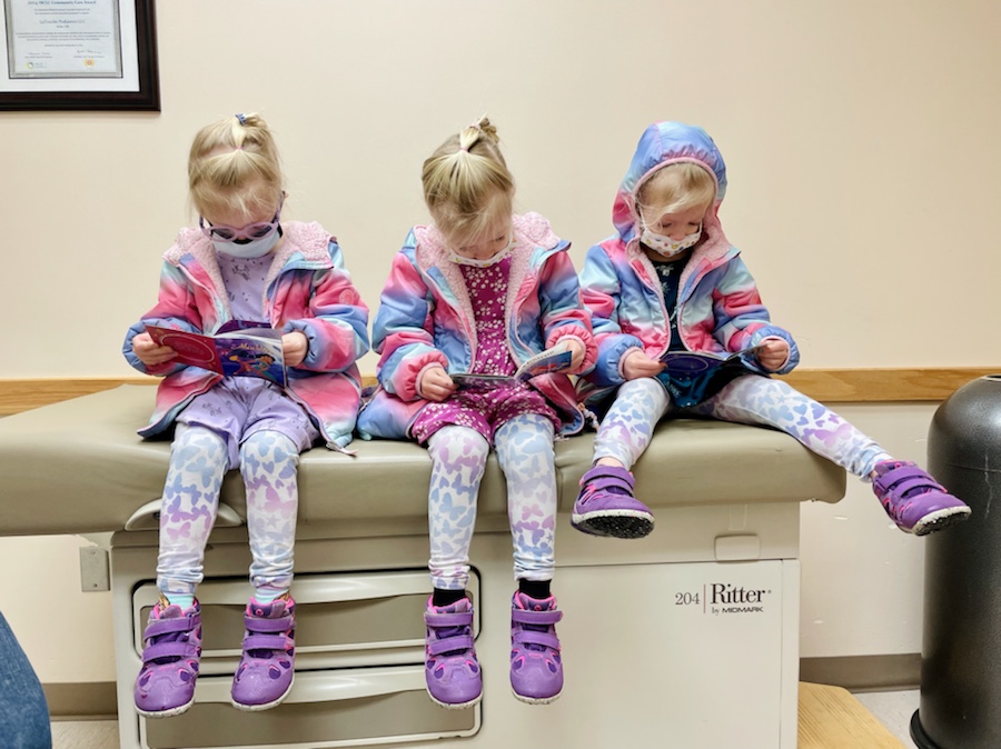 Craig and I took all three to the doctor this week just to ensure we aren’t missing something on the prolonged coughing fits. It’s been a bit since a triple pediatrician visit and it started out super strong, with all three hanging out and “reading” their mini princess books and cooperating with each other; by the end of the visit they were climbing the walls of the waiting area and ready to go. They all did unusually well at obeying the doctor, who checked lungs, ears, nose and mouth with great cooperation. The pediatrician confirmed everyone just has a viral cough, not croup, not COVID, not RSV, not pneumonia from me (thank goodness), just a mild, fever-less cough. Good news I guess!