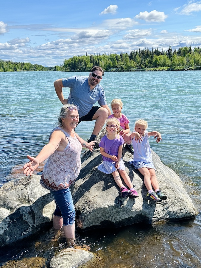 We walked along the boardwalk of the Kenai River, the opposite direction we explored last year after the car broke down. The chanting of kids don’t float! followed our brigade, since life jackets weren’t on and the adults were carefully paying attention. Dandelions, well really any type of flower, were collected into kid bouquets and carried in hands and pockets for the entire excursion. Little did we know this direction took us right to an warm, open (Alaskan standards) beach area with lots of climbing rocks along the riverbank. The girls tossed rocks and sticks into the water with enthusiasm and explored. With the sun finally showing its face, it became surprisingly warm out and almost like summer was upon us! The girls asked to climb out to the farthest rock and in true grandma style, Sue removed her socks and shoes and walked out barefoot to assist them to it.