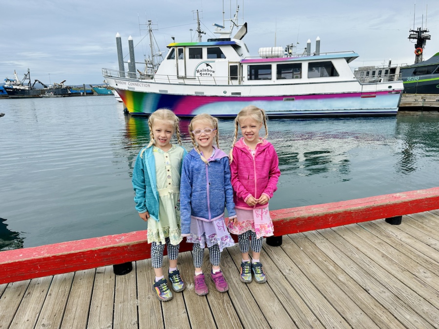 While of course we visited some of the touristy spots, which are boring to elaborate on here, one cute adventure was spent out on the Homer Spit, walking around the pier and looking at the boats. Personally I enjoy reading all the creative boat names, but since the girls can’t read yet, they enjoyed looking at the colors, fish in the water, and activity happening before them. When asked one thing they remember from the trip, it is pretty likely to be seeing the rainbow boat out in the water. It caused quite the stir of excitement and we HAD to walk over and see it up close and personal. Grandma convinced them the “dock police” would come and haul them away if they weren’t on good behavior, which included no running and goofing off because kids don’t float! A few passerby’s joined in on that humor and acted like they might be those enforcers. It was great. We also witnessed a random boat tour loading up and asked Captain Bob twenty questions about his boat. Bob was good sport and joined in on the fun.