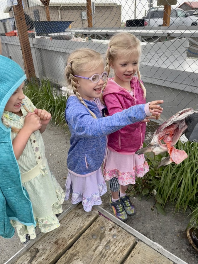 As we rounded the turn back to the car we spotted several fishermen filleting catches from the day, one a good sized halibut and the other was cleaning salmon heads for a restaurant here in Anchorage that makes soup. The intrigue intensified and all three asked a lot of questions, wanting to get back in there and check it all out. The salmon fisherman was also a good sport, in general everyone we spoke to was so friendly, and brought one head around to show the girls. All three touched the eyeballs, because why not, and Reagan might have licked her fingers after and then wiped them on her dress. Gross! This picture accurately depicts the reactions; I trend toward the same feeling as Reagan when it comes to fish eyeballs. You could definitely tell they were bummed we didn’t get to do gil netting and we received a few questions why we didn’t go.