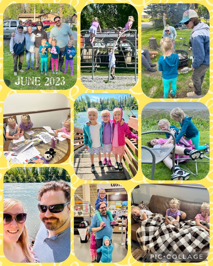 With no daily plan or planned places to be, we adventured and explored as we felt like it. We dilly dallied in the mornings and the kids played, much less structured mornings than when we are at home and getting things done. We popped into the Kenai jump park to burn some energy and strolled the farmers market in Soldotna, playing at the playground behind it and trying out a couple tasty treats. The girls fearlessly slid down the extremely old, metal slide- probably installed when Craig and I were kids and now seen as more dangerous- and checked out the old-school monkey bars. At the market one vendor displayed a beautiful wooden bench with a fishing pole sealed into it; the girls all checked that out with interest at how it would come out for use. So funny!
