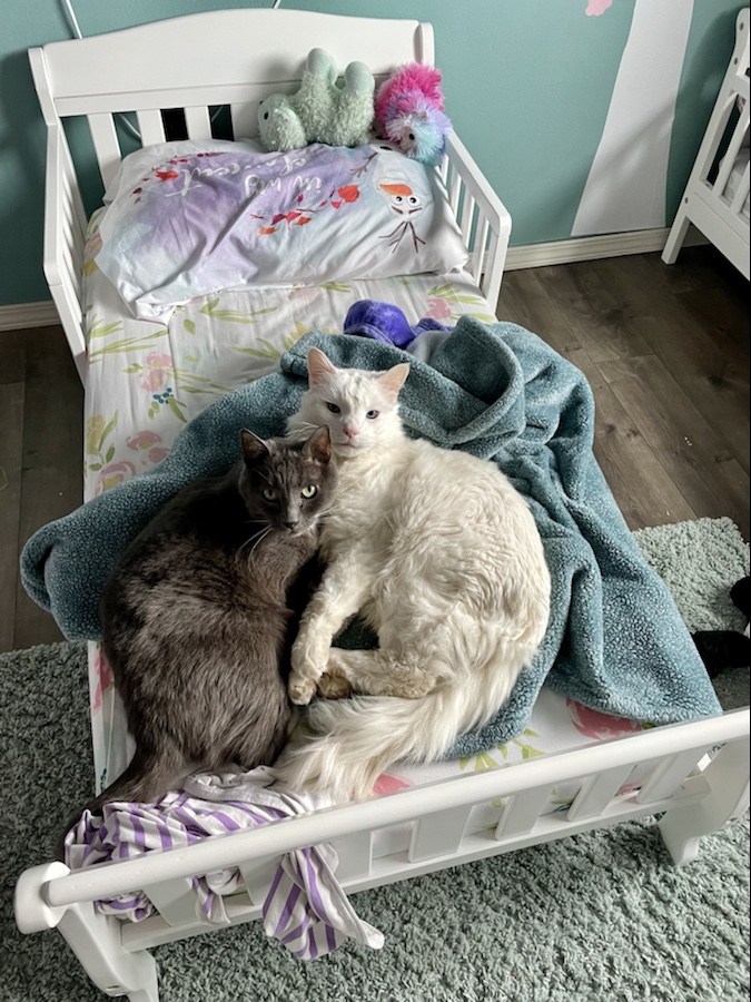 Rafi was named after one of my beloved Red Wing players, Rafalski, about a decade ago. He was a rescue that instantly loved having a whole house to himself, having a plentiful amount of food and snuggles, specifically from me. He HATED all the house projects Craig forced him to endure, especially anytime his brother Chris showed up with some power tools, such as new windows and doors in our first house, and when he overcame that obstacle, we got a dog. It took barely any time for him to warm up to our other cat, Rory, and they became fast friends and stayed that way through the years. He was less than impressed at our promotion to triplet parents, even less impressed when that reduced his snuggles and our minimal sitting still for YEARS. Only in the last six months or so have either cat decided it is safe to go near the kids and that sometimes results in petting and snuggles. I’m glad I got a good evening snuggle with him last night, full of purring before I drifted off to sleep.