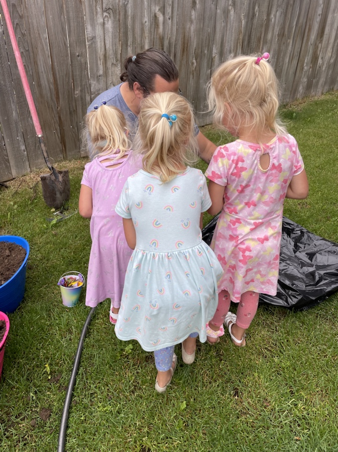 Everyone absolutely wanted to put flowers all over him and picked from around the garden (sorry Grandma), laying them gently down and putting handfuls of dirt on him. I have to say, for their age, they did a great job asking questions, trying to understand it and being respectful. Craig did a great job coaching and explaining through it.