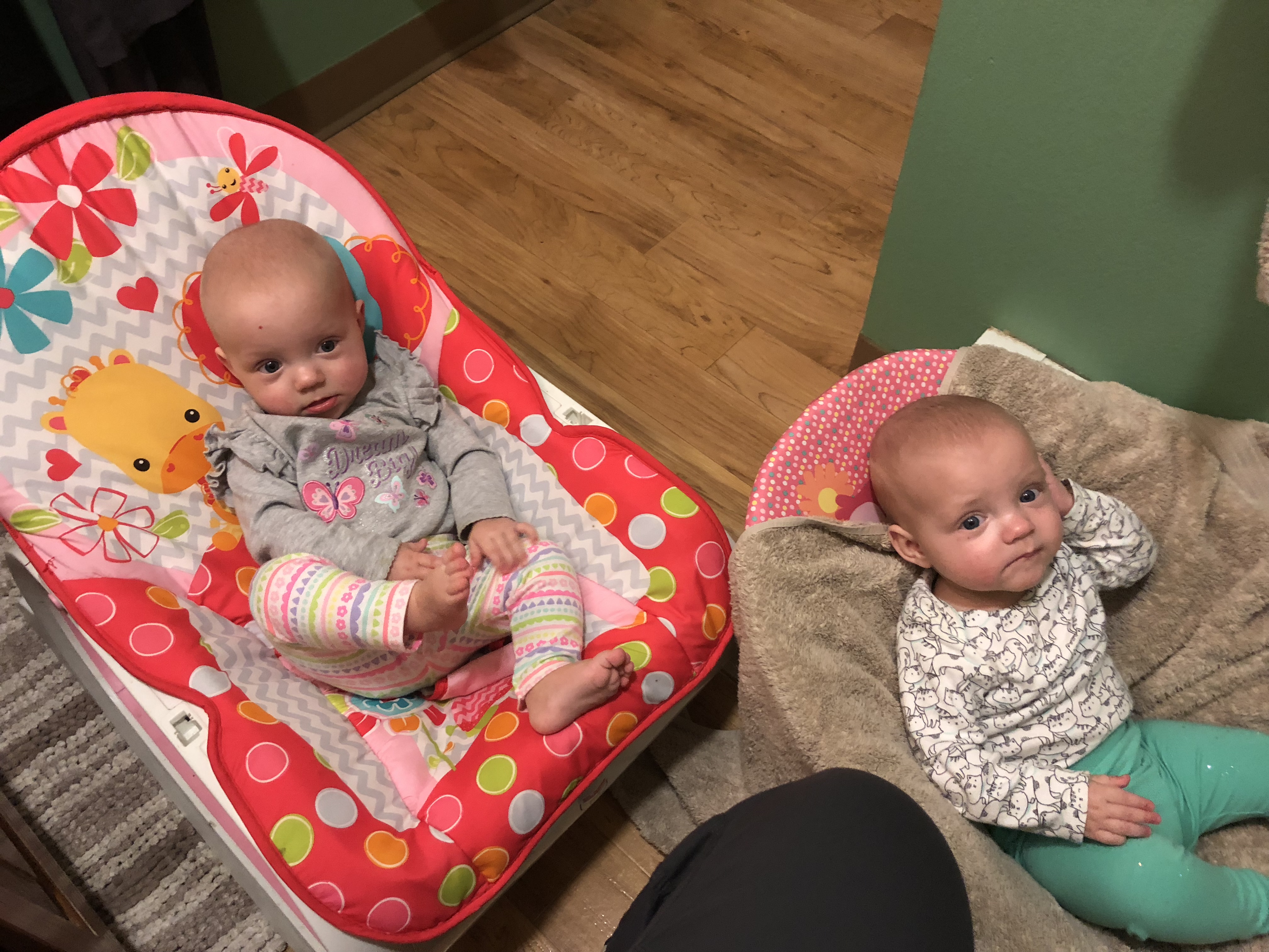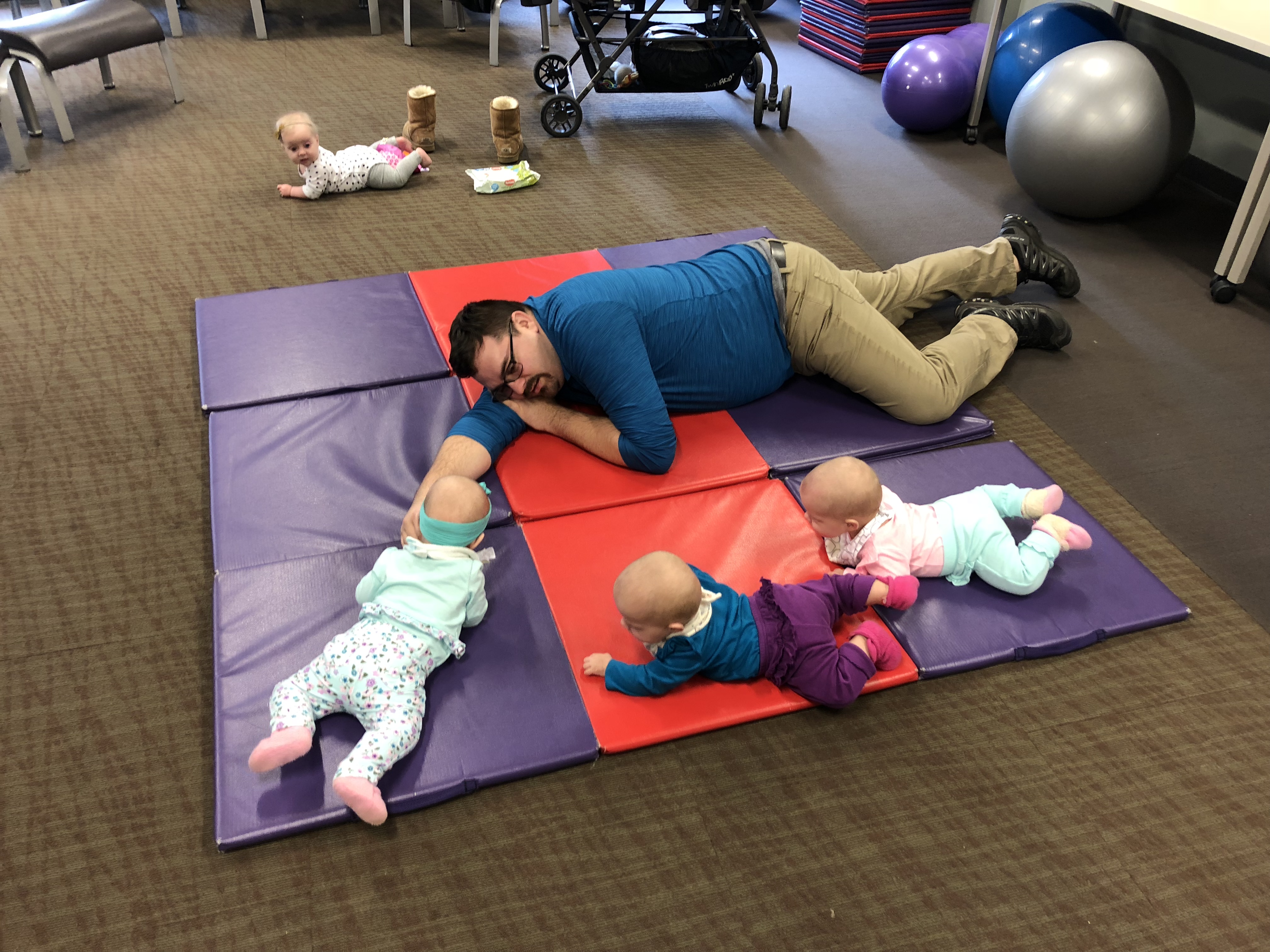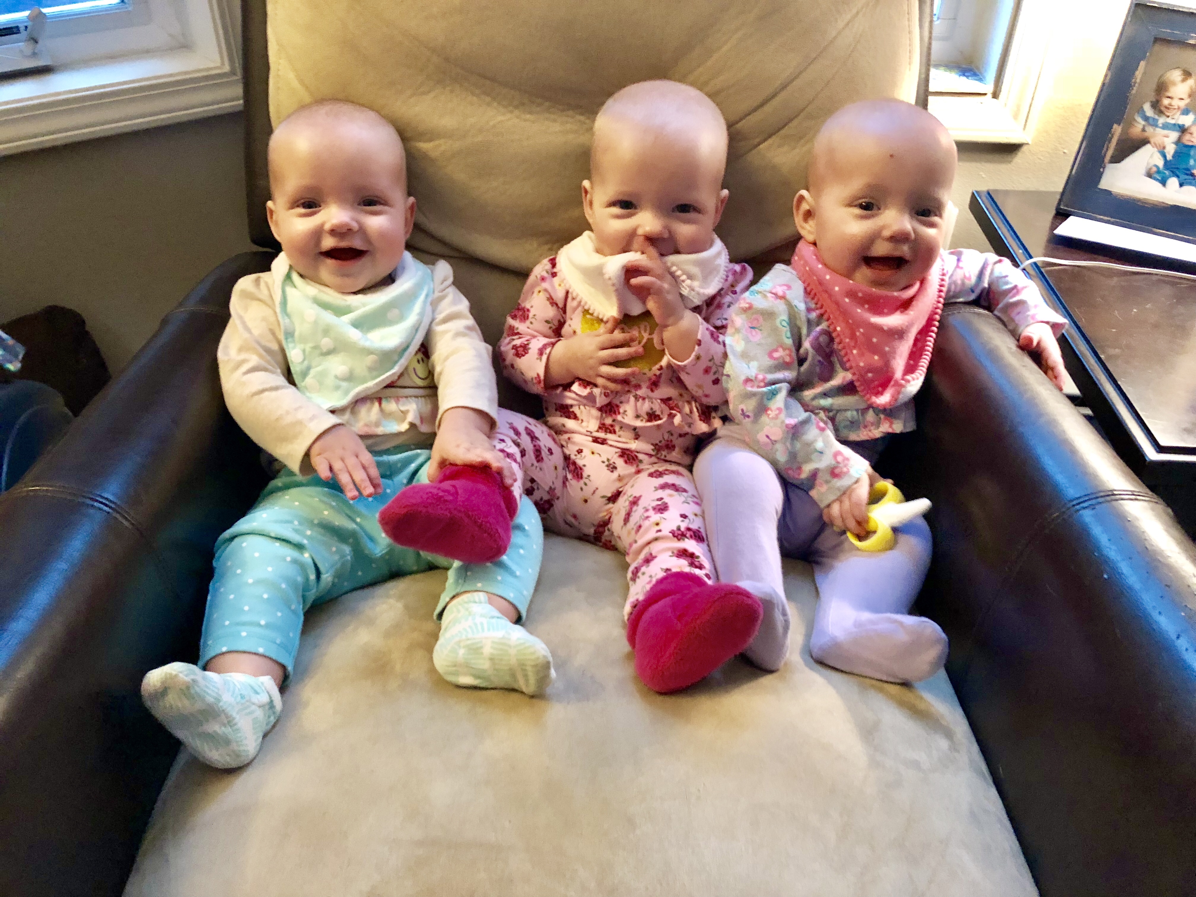 Each day we practice sitting up, eating baby food and hand eye coordination while playing with toys. We are just around the corner from them independently sitting up and playing, as they are getting pretty good at it (with mild help).