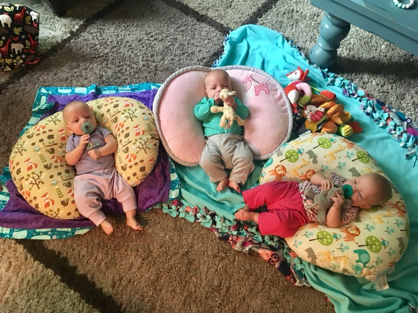 Reagan is starting to realize they are there and reaching for things, and Emerie has figured out she can hold things in her mouth when she wants to, although not quite that her hands are in her control.