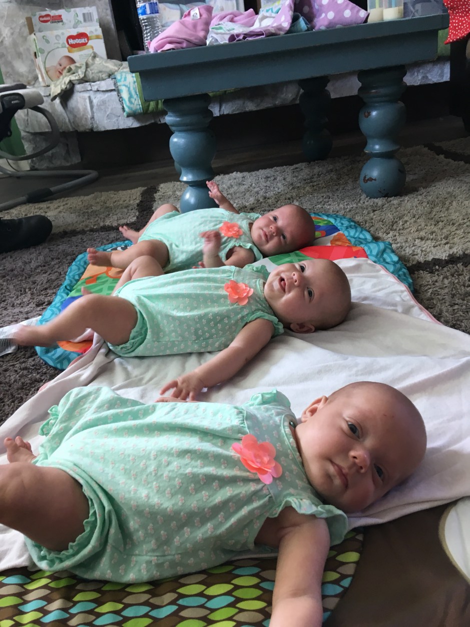 They lasted four nights in our room due to their noisiness. Seriously babies can be so loud when they sleep…they chatter, hiccup, and talk to each other all night long. So pretty quickly they started sleeping in the nursery, all 3 in one crib and separated by mesh dividers.
