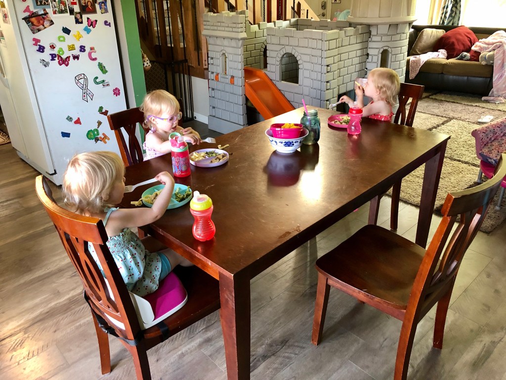 And the last gem on the new, toddler conversations in our house- Auntie Megan, who we play with constantly because the girls adore her boys, taught the girls about some new body parts that differ from theirs. This happened out of a diaper change, because every toddler in the house must participate in them and provide their inputs; she explained that boys have a penis and girls have a “gina”. Well, if you must know, this is a very hot topic in our household now that is randomly brought up day-to-day. One of those random times happened to be while we were at Fred Meyer last weekend and to my dismay (and delight, not sure?), all three were chanting daddy-penis, mommy-penis, rather loudly I might add, across the store. I could see the smiles and chuckles of passer-bys through their masks, as we headed for the checkout line at a bit faster pace! At some point they might accept that mommy does not have that equipment, similarly neither do they, but apparently that is not for my age two beauties. Silver lining of that shopping trip…we made it through the whole shopping experience without any diapers on or accidents!